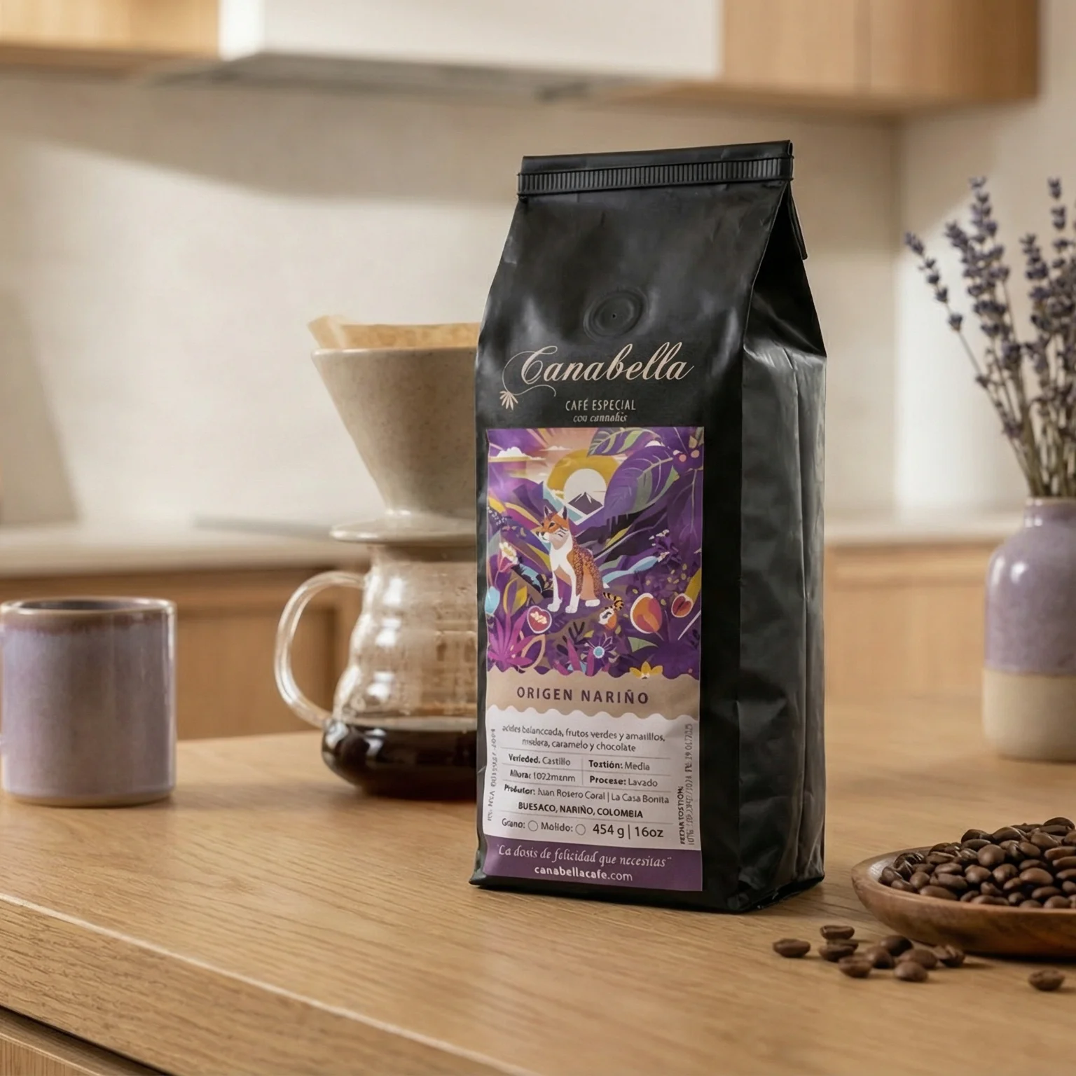 3 libras de Canabella Café Especial con Cannabis origen de Buesaco, Nariño, Colombia, tostado medio en grano o molido